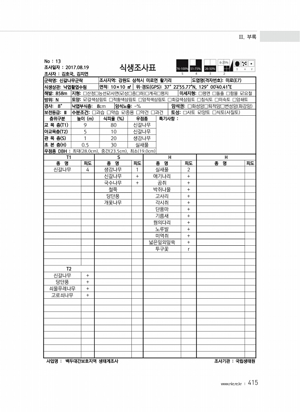 Ⅲ. 부록 www.nie.re.kr ? 415 No 13 조사일자 2017.08.19 조사자 김호국, 김지연 식생조사표 군락명신갈나무군락 조사지역강원도 삼척시 미로면 활기리 도엽명 격자번호 미로 E7 식생상관낙엽활엽수림 면적10×10 ㎡ 위·경도 GPS 37°2255.77N, 129°0040.41E 해발858m 지형□산정□능선?사면 ?상□중□하 □계곡□평지 미세지형□평면 □돌출 □함몰 ?요철 방위N 토양?갈색삼림토 □적황색삼림토 □암적색삼림토 □회갈색삼림토 □침식토 □미숙토 □암쇄토 경사8° 낙엽부식층8cm 암석노출-% 암석권□화성암□퇴적암□변성암 화강암 보전등급Ⅲ 수분조건□과습 □약습 ?중용 □약건 □과건 토성□사토 ?양토 □식토 사질토 층위구분 높이 m 식피율 % 우점종 특기사항 교 목 층 T1 9 80...