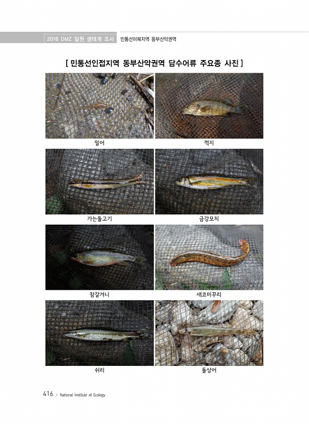 2016 DMZ 일원 생태계 조사 민통선이북지역 동부산악권역 416 ? National Institute of Ecology [ 민통선인접지역 동부산악권역 담수어류 주요종 사진 ] 밀어 꺽지 가는돌고기 금강모치 참갈겨니 새코미꾸리 쉬리돌상어