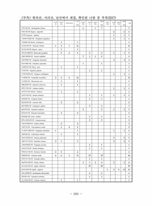390 부록 한라산, 지리산, 남산에서 채집, 확인된 나방 종 목록 2017 소나무 림 신갈나 무림 아카시나무림 남산 합계 구상나 무림 소나무 림 신갈나 무림 지리산 합계 구상나 무림 소나무 림 신갈나 무림 한라산 합계 총계 담색수염나방 Zanclognatha lilacina 6 1 7 7 대만수염나방 Hypena trigonalis 6 6 6 독나방 Euproctis subflava 1 1 1 두점깨다시짤름나방 Prolophota trigonifera 1 1 1 두점짤름나방 Rivula inconspicua 1 1 1 둥근줄수염나방 Paracolax tristalis 1 9 1 11 11 뒷노랑수염나방 Hypena amica 1 1 1 뒷무늬꼬마짤름나방 Micreremites pyraloides 2 4 6...