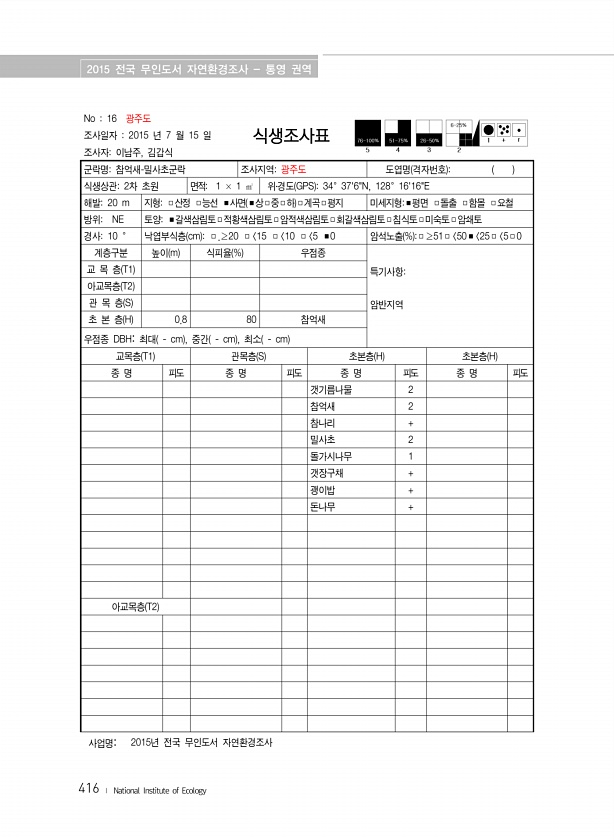 2015 전국 무인도서 자연환경조사 통영 권역 416 ? National Institute of Ecology No 16 광주도 조사일자 2015 년 7 월 15 일 조사자이남주, 김갑식 식생조사표 군락명참억새-밀사초군락 조사지역광주도 도엽명 격자번호 식생상관2차 초원 면적1 × 1 ㎡ 위?경도 GPS 34°376N, 128°1616E 해발20 m 지형□산정 □능선 ■사면 ■상□중□하 □계곡□평지 미세지형■평면 □돌출 □함몰 □요철 방위NE 토양■갈색삼림토□적황색삼림토□암적색삼림토□회갈색삼림토□침식토□미숙토□암쇄토 경사10 ° 낙엽부식층 cm □.≥20 □ 15 □ 10 □ 5 ■0 암석노출 % □≥51□ 50■ 25□ 5□0 계층구분 높이 m 식피율 % 우점종 특기사항암반지역 교 목 층 T1 아교목층 T2...
