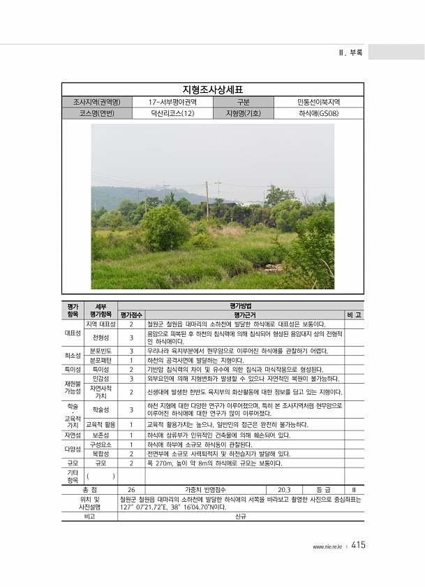 Ⅲ. 부록 www.nie.re.kr ? 415 지형조사상세표 조사지역 권역명 17-서부평야권역 구분 민통선이북지역 코스명 연번 덕산리코스 12 지형명 기호 하식애 GS08 평가 항목 세부 평가항목 평가방법 평가점수 평가근거 비 고 대표성 지역 대표성 2 철원군 철원읍 대마리의 소하천에 발달한 하식애로 대표성은 보통이다. 전형성 3 용암으로 피복된 후 하천의 침식력에 의해 침식되어 형성된 용암대지 상의 전형적 인 하식애이다. 희소성 분포빈도 3 우리나라 육지부분에서 현무암으로 이루어진 하식애를 관찰하기 어렵다. 분포패턴 1 하천의 공격사면에 발달하는 지형이다. 특이성 특이성 2 기반암 침식력의 차이 및 유수에 의한 침식과 마식작용으로 형성된다. 재현불 가능성 민감성 3 외부요인에 의해 지형변화가 발생할 수 있...