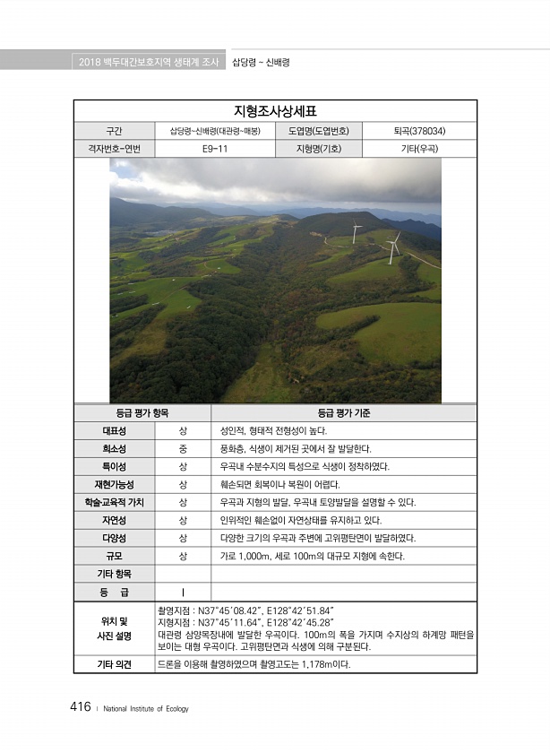 2018 백두대간보호지역 생태계 조사 삽당령 신배령 416 ? National Institute of Ecology 지형조사상세표 구간 삽당령신배령 대관령매봉 도엽명 도엽번호 퇴곡 378034 격자번호-연번 E9-11 지형명 기호 기타 우곡 등급 평가 항목 등급 평가 기준 대표성 상 성인적, 형태적 전형성이 높다. 희소성 중 풍화층, 식생이 제거된 곳에서 잘 발달한다. 특이성 상 우곡내 수분수지의 특성으로 식생이 정착하였다. 재현가능성 상 훼손되면 회복이나 복원이 어렵다. 학술?교육적 가치 상 우곡과 지형의 발달, 우곡내 토양발달을 설명할 수 있다. 자연성 상 인위적인 훼손없이 자연상태를 유지하고 있다. 다양성 상 다양한 크기의 우곡과 주변에 고위평탄면이 발달하였다. 규모 상 가로 1,000m, 세로 100...
