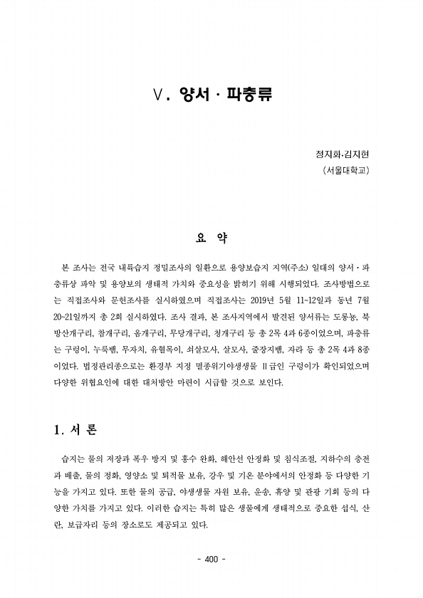 400 Ⅴ. · 양서 파충류 · 본 조사는 전국 내륙습지 정밀조사의 일환으로 용양보습지 지역 주소 일대의 양서 파 · 충류상 파악 및 용양보의 생태적 가치와 중요성을 밝히기 위해 시행되었다 조사방법으로 는 직접조사와 문헌조사를 실시하였으며 직접조사는 년 월 일과 동년 월 2019 5 1112 7 2021 2 일까지 총 회 실시하였다 조사 결과 본 조사지역에서 발견된 양서류는 도롱뇽 북 , , 방산개구리 참개구리 옴개구리 무당개구리 청개구리 등 총 목 과 종이었으며 파충류 , , , , 2 4 6 , 는 구렁이 누룩뱀 무자치 유혈목이 쇠살모사 살모사 줄장지뱀 자라 등 총 목 과 종 , , , , , , , 2 4 8 이었다 법정관리종으로는 환경부 지정 멸종위기야생생물 급인 구렁이가 확인되었으며 Ⅱ 다양한 위협...
