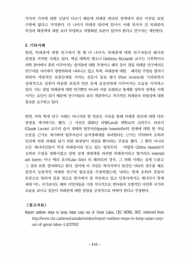 각자의 가치에 대한 신념이 다르기 때문에 외래종 관리의 정책에서 잦은 이견을 보일 수밖에 없다고 지적한다. 더 나아가 외래종 관리에 있어서 이해 당사자 간 외래종의 특성과 해결책에 대한 보다 투명하고 차별화된 토론이 있어야 한다고 연구자는 제안한다. 3. 기타사례 한편, 외래종에 대한 연구에서 한 발 더 나아가, 외래종에 대한 연구자들의 왜곡된 관점을 지적한 사례도 있다. 맥길 대학의 앤소니 Anthony Ricciardi 교수는 기후학이나 의학 분야에서 흔히 이루어지는 증거들에 대한 부정이나 왜곡 등이 침입 외래종 연구에서도 연구자들 사이에서 광범위하게 나타나고 있고 특히, 외래종에 대한 왜곡된 주장을 펼치기 위하여 객관적인 검증단계를 거치는 전문가 동료 평가 Peer review 를 기피하면서 상대적으로...