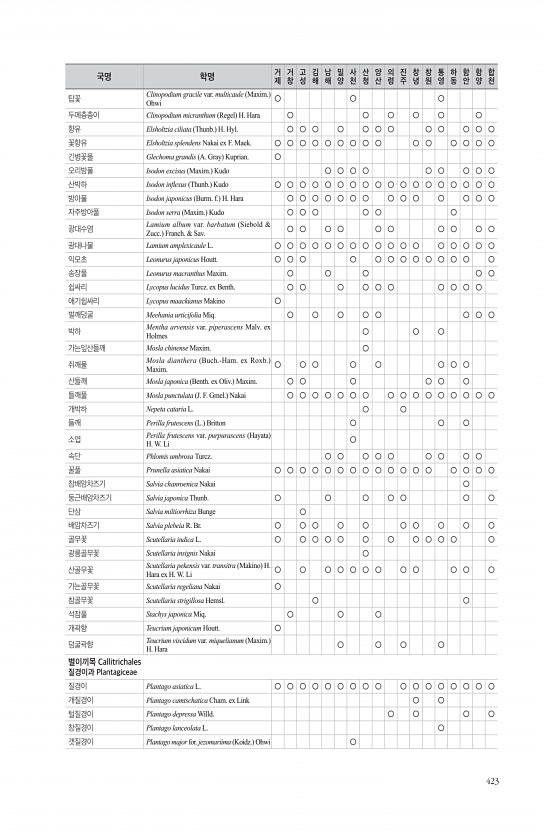 423 탑꽃 Clinopodium gracile var. multicaule Maxim. Ohwi ○ ○ ○ 두메층층이 Clinopodium micranthum Regel H. Hara ○ ○ ○ ○ ○ ○ 향유 Elsholtzia ciliata Thunb. H. Hyl. ○ ○ ○ ○ ○ ○ ○ ○ ○ ○ ○ ○ 꽃향유 Elsholtzia splendens Nakai ex F. Maek. ○ ○ ○ ○ ○ ○ ○ ○ ○ ○ ○ ○ ○ ○ ○ 긴병꽃풀 Glechoma grandis A. Gray Kuprian. ○ 오리방풀 Isodon excisus Maxim. Kudo ○ ○ ○ ○ ○ ○ ○ ○ ○ 산박하 Isodon infexus Thunb. Kudo ○ ○ ○ ○ ○ ○ ○ ○ ○ ○ ○ ○ ○ ○ ...
