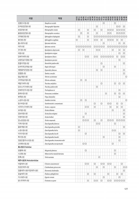 425 앞붉은수염나방 Simplicia rectalis ○ ○ 담색쌍검은밤나방 Sineugraphe bipartita ○ ○ ○ ○ 쌍검은밤나방 Sineugraphe exusta ○ ○ ○ ○ ○ ○ ○ ○ ○ ○ ○ 물결쌍검은밤나방 Sineugraphe oceanica ○ ○ ○ ○ ○ ○ ○ ○ ○ 꼬마봉인밤나방 Sphragifera biplagiata ○ ○ ○ ○ ○ ○ ○ ○ ○ ○ ○ ○ ○ ○ ○ ○ ○ 봉인밤나방 Sphragifera sigillata ○ ○ ○ ○ ○ ○ ○ ○ ○ ○ 톱니태극나방 Spirama helicina ○ ○ ○ 태극나방 Spirama retorta ○ ○ ○ ○ ○ ○ ○ ○ ○ ○ ○ ○ ○ ○ ○ ○ ○ ○ ○ ○ ○ 잔디밤나방 Spodoptera deprava...