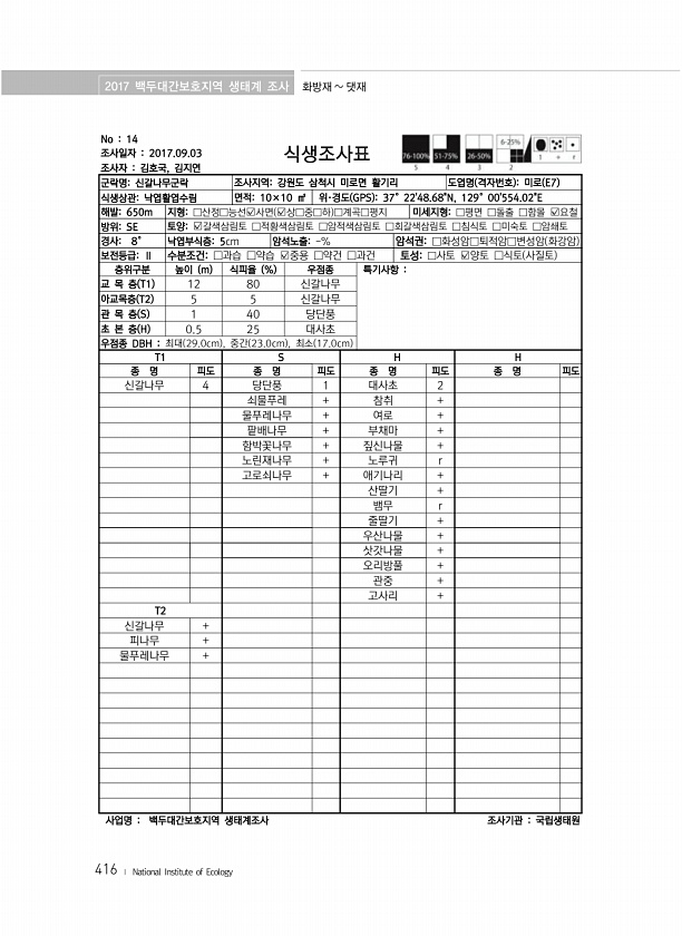 2017 백두대간보호지역 생태계 조사 화방재 댓재 416 ? National Institute of Ecology No 14 조사일자 2017.09.03 조사자 김호국, 김지연 식생조사표 군락명신갈나무군락 조사지역강원도 삼척시 미로면 활기리 도엽명 격자번호 미로 E7 식생상관낙엽활엽수림 면적10×10 ㎡ 위·경도 GPS 37°2248.68N, 129°00554.02E 해발650m 지형□산정□능선?사면 ?상□중□하 □계곡□평지 미세지형□평면 □돌출 □함몰 ?요철 방위SE 토양?갈색삼림토 □적황색삼림토 □암적색삼림토 □회갈색삼림토 □침식토 □미숙토 □암쇄토 경사8° 낙엽부식층5cm 암석노출-% 암석권□화성암□퇴적암□변성암 화강암 보전등급Ⅱ 수분조건□과습 □약습 ?중용 □약건 □과건 토성□사토 ?양토 □식토 사질...