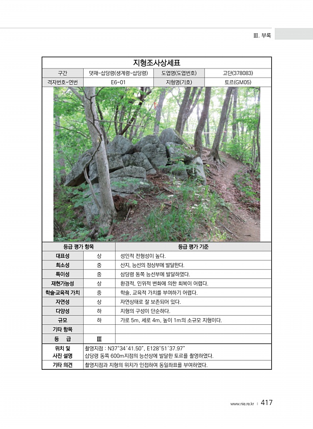 Ⅲ. 부록 www.nie.re.kr ? 417 지형조사상세표 구간 댓재삽당령 생계령삽당령 도엽명 도엽번호 고단 378083 격자번호-연번 E6-01 지형명 기호 토르 GM05 등급 평가 항목 등급 평가 기준 대표성 상 성인적 전형성이 높다. 희소성 중 산지, 능선의 정상부에 발달한다. 특이성 중 삼당령 동쪽 능선부에 발달하였다. 재현가능성 상 환경적, 인위적 변화에 의한 회복이 어렵다. 학술?교육적 가치 중 학술, 교육적 가치를 부여하기 어렵다. 자연성 상 자연상태로 잘 보존되어 있다. 다양성 하 지형의 구성이 단순하다. 규모 하 가로 5m, 세로 4m, 높이 1m의 소규모 지형이다. 기타 항목 등 급 Ⅲ 위치 및 사진 설명 촬영지점 N37°34′41.50″, E128°51′37.97″ 삽당령 동쪽 600m...