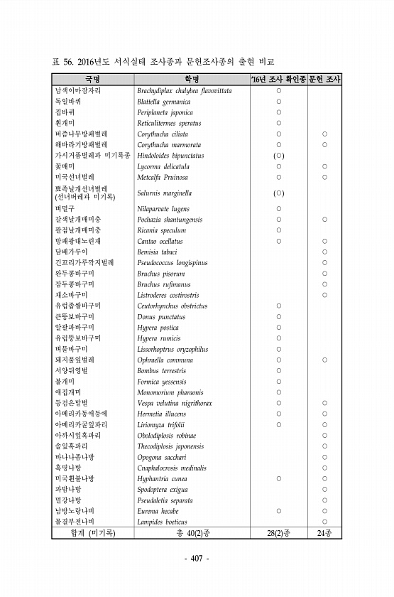 407 표 56. 2016년도 서식실태 조사종과 문헌조사종의 출현 비교 국명 학명 ‘16년 조사 확인종 문헌 조사 남색이마잠자리 Brachydiplax chalybea flavovittata ○ 독일바퀴 Blattella germanica ○ 집바퀴 Periplaneta japonica ○ 흰개미 Reticulitermes speratus ○ 버즘나무방패벌레 Corythucha ciliata ○ ○ 해바라기방패벌레 Corythucha marmorata ○ ○ 가시거품벌레과 미기록종 Hindoloides bipunctatus ○ 꽃매미 Lycorma delicatula ○ ○ 미국선녀벌레 Metcalfa Pruinosa ○ ○ 뾰족날개선녀벌레 선녀버레과 미기록 Salurnis marginella ○ 벼멸구 N...