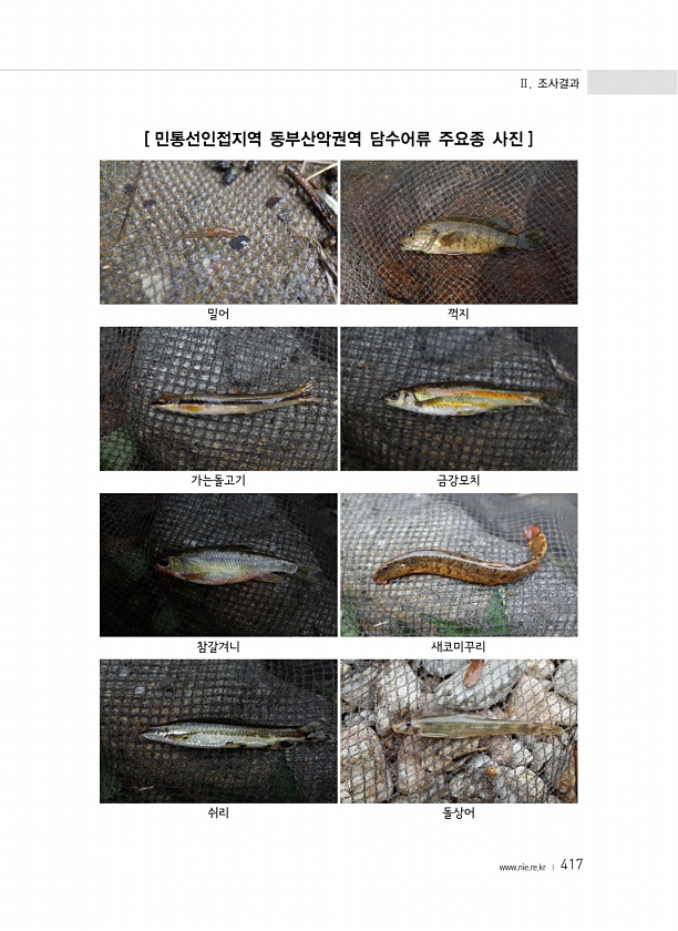 Ⅱ. 조사결과 www.nie.re.kr ? 417 [ 민통선인접지역 동부산악권역 담수어류 주요종 사진 ] 밀어 꺽지 가는돌고기 금강모치 참갈겨니 새코미꾸리 쉬리돌상어