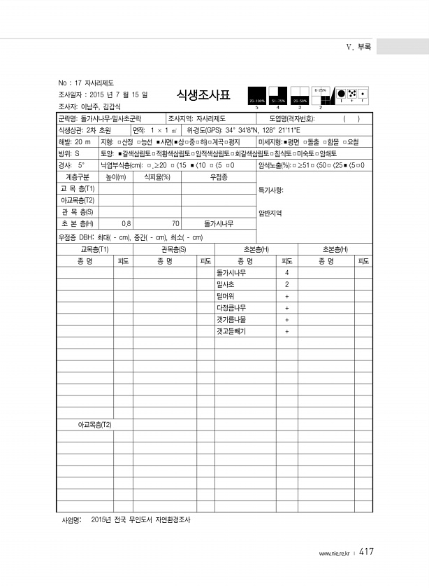 Ⅴ. 부록 www.nie.re.kr ? 417 No 17 자사리제도 조사일자 2015 년 7 월 15 일 조사자이남주, 김갑식 식생조사표 군락명돌가시나무-밀사초군락 조사지역자사리제도 도엽명 격자번호 식생상관2차 초원 면적1 × 1 ㎡ 위?경도 GPS 34°348N, 128°2111E 해발20 m 지형□산정 □능선 ■사면 ■상□중□하 □계곡□평지 미세지형■평면 □돌출 □함몰 □요철 방위S 토양■갈색삼림토□적황색삼림토□암적색삼림토□회갈색삼림토□침식토□미숙토□암쇄토 경사5° 낙엽부식층 cm □.≥20 □ 15 ■ 10 □ 5 □0 암석노출 % □≥51□ 50□ 25■ 5□0 계층구분 높이 m 식피율 % 우점종 특기사항암반지역 교 목 층 T1 아교목층 T2 관 목 층 S 초 본 층 H 0.8 70 돌가시나무 우점종...
