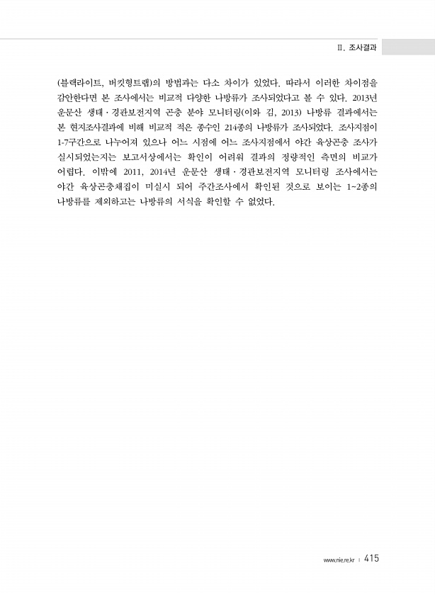 Ⅱ. 조사결과 www.nie.re.kr ? 415 블랙라이트, 버킷형트랩 의 방법과는 다소 차이가 있었다. 따라서 이러한 차이점을 감안한다면 본 조사에서는 비교적 다양한 나방류가 조사되었다고 볼 수 있다. 2013년 운문산 생태·경관보전지역 곤충 분야 모니터링 이와 김, 2013 나방류 결과에서는 본 현지조사결과에 비해 비교적 적은 종수인 214종의 나방류가 조사되었다. 조사지점이 1-7구간으로 나누어져 있으나 어느 시점에 어느 조사지점에서 야간 육상곤충 조사가 실시되었는지는 보고서상에서는 확인이 어려워 결과의 정량적인 측면의 비교가 어렵다. 이밖에 2011, 2014년 운문산 생태·경관보전지역 모니터링 조사에서는 야간 육상곤충채집이 미실시 되어 주간조사에서 확인된 것으로 보이는 12종의 나방류를 제외하고는...