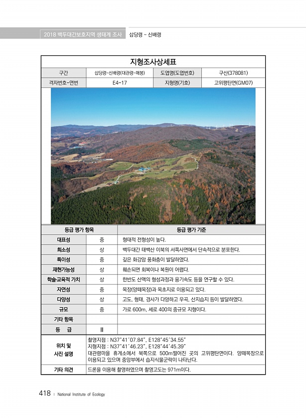 2018 백두대간보호지역 생태계 조사 삽당령 신배령 418 ? National Institute of Ecology 지형조사상세표 구간 삽당령신배령 대관령매봉 도엽명 도엽번호 구산 378081 격자번호-연번 E4-17 지형명 기호 고위평탄면 GM07 등급 평가 항목 등급 평가 기준 대표성 중 형태적 전형성이 높다. 희소성 상 백두대간 태백산 이북의 서쪽사면에서 단속적으로 분포한다. 특이성 중 깊은 화강암 풍화층이 발달하였다. 재현가능성 상 훼손되면 회복이나 복원이 어렵다. 학술?교육적 가치 상 한반도 산맥의 형성과정과 융기속도 등을 연구할 수 있다. 자연성 중 목장 양떼목장 과 목초지로 이용되고 있다. 다양성 상 고도, 형태, 경사가 다양하고 우곡, 산지습지 등이 발달하였다. 규모 중 가로 600m, 세로 ...