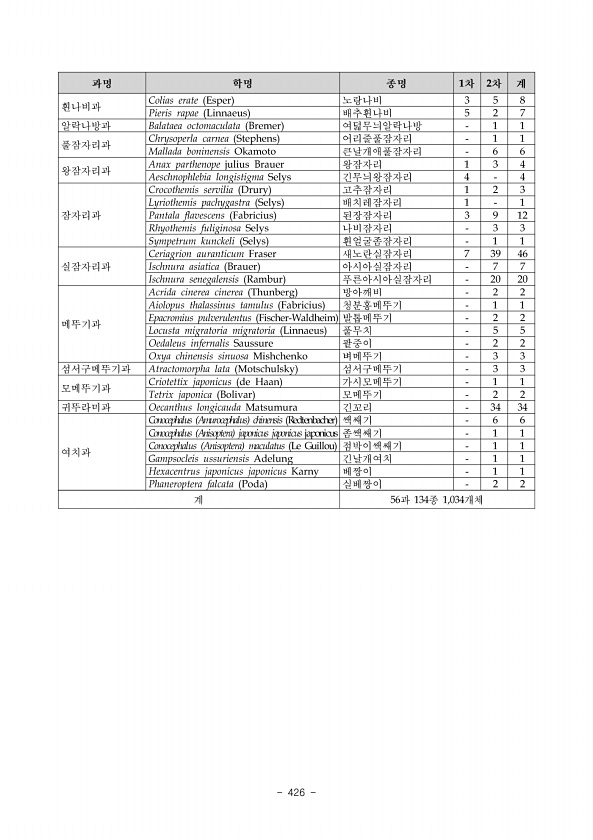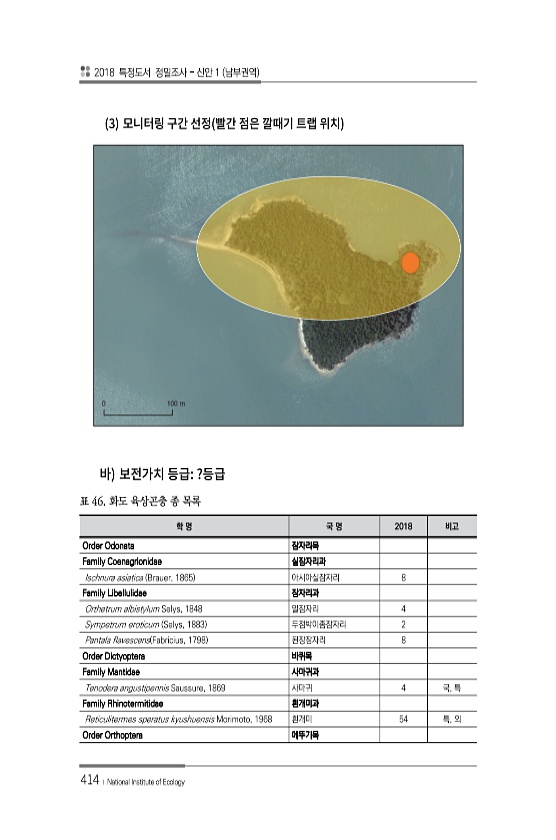 2018 특정도서 정밀조사 신안 1 남부권역 414 ? National Institute of Ecology 3 ? 학 명 국 명 2018 비고 Order Odonata 잠자리목 Family Coenagrionidae 실잠자리과 Ischnura asiatica Brauer, 1865 아시아실잠자리 8 Family Libellulidae 잠자리과 Orthetrum albistylum Selys, 1848 밀잠자리 4 Sympetrum eroticum Selys, 1883 두점박이좀잠자리 2 Pantala flavescens Fabricius, 1798 된장잠자리 8 Order Dictyoptera 바퀴목 Family Mantidae 사마귀과 Tenodera angustipennis Saussure, 1869 ...