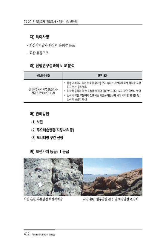2018 특정도서 정밀조사 신안 1 북부권역 412 ? National Institute of Ecology 화산각력암과 화산력 응회암 분포 화산 유동구조 선행연구문헌 연구 내용 전국무인도서 자연환경조사- 신안 6 권역 2011 년 ? 중생대 백악기 말에 분출된 유천층군에 속하는 화산암류로서 각력을 포함 하고 있는 응회암류 ? 화학적 풍화에 약한 특성을 보이며 기반암 표면에 크고 작은 타포니 발달 ? 암석의 약한 부분에서 진행되는 차별풍화현상에 의해 기이한 형태를 띤 암석이 곳곳에 형성 1 2 3 사진 498. 유문암질 화산각력암 사진 499. 현무암질 관입 및 화강암질관입체