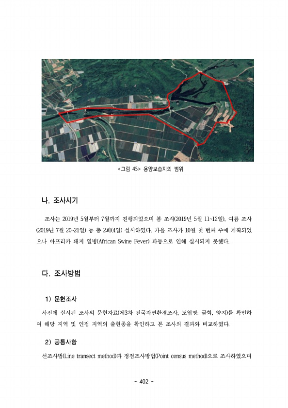 402 그림 45 용양보습지의 범위 조사는 년 월부터 월까지 진행되었으며 봄 조사 년 월 일 여름 조사 2019 5 7 2019 5 1112 , 2019 7 2021 2 4 년 월 일 등 총 회 일 실시하였다 가을 조사가 월 첫 번째 주에 계획되었 10 으나 아프리카 돼지 열병 African Swine Fever 파동으로 인해 실시되지 못했다. 사전에 실시된 조사의 문헌자료 제 차 전국자연환경조사 도엽명 금화 양지 를 확인하 3 , , 여 해당 지역 및 인접 지역의 출현종을 확인하고 본 조사의 결과와 비교하였다. 선조사법 Line transect method 과 정점조사방법 Point census method 으로조사하였으며