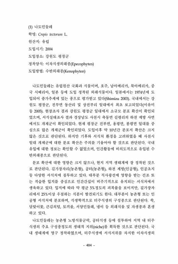 1 나도민들레 학명Crepis tectorum L. 원산지유럽 도입시기2004 도입장소강원도 평창군 정착양식이차식생외래종 Epecophyten 도입방법수반외래종 Kenophyten 나도민들레는 유럽원산 국화과 식물이며, 호주, 남아메리카, 북아메리카, 중 국 시베리아, 일본 등에 도입 정착된 외래식물이다. 일본에서는 1974년에 도 입되어 증가추세에 있는 종으로 평가받고 있다 Shimizu 2003 국내에서는 강 원도 평창군, 진부면 동산리 및 상진부리 일대에서 최초 보고되었다 이유미 등 2005 현장조사 결과 강원도 평창군 일대에서 소규모 분포 확산이 확인되 었으며, 서식실태조사 결과 경상남도 사천시 축동면 길평리의 하천 제방 사면 에서도 개체군이 확인되었다. 현재 평창군 진부면, 용평면, 봉평면 일대를 ...