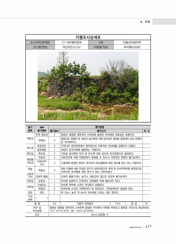 Ⅲ. 부록 www.nie.re.kr ? 417 지형조사상세표 조사지역 권역명 17-서부평야권역 구분 민통선이북지역 코스명 연번 덕산리코스 14 지형명 기호 하식애 GS08 평가 항목 세부 평가항목 평가방법 평가점수 평가근거 비 고 대표성 지역 대표성 2 철원군 철원읍 대마리의 소하천에 발달한 하식애로 대표성은 보통이다. 전형성 3 용암으로 피복된 후 하천의 침식력에 의해 침식되어 형성된 용암대지 상의 전형적 인 하식애이다. 희소성 분포빈도 3 우리나라 육지부분에서 현무암으로 이루어진 하식애를 관찰하기 어렵다. 분포패턴 1 하천의 공격사면에 발달하는 지형이다. 특이성 특이성 2 기반암 침식력의 차이 및 유수에 의한 침식과 마식작용으로 형성된다. 재현불 가능성 민감성 3 외부요인에 의해 지형변화가 발생할 수 있...