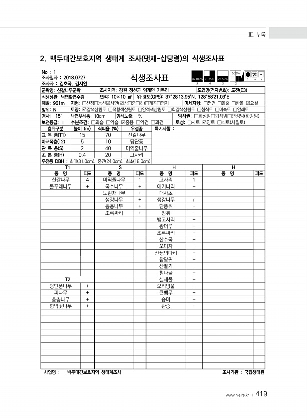 Ⅲ. 부록 www.nie.re.kr ? 419 2. 백두대간보호지역 생태계 조사 댓재삽당령 의 식생조사표 No 1 조사일자 2018.0727 조사자 김호국, 김지연 식생조사표 군락명신갈나무군락 조사지역강원 정선군 임계면 가목리 도엽명 격자번호 도전 E3 식생상관낙엽활엽수림 면적10×10 ㎡ 위·경도 GPS 37°2813.95N, 128°5821.03E 해발961m 지형□산정□능선?사면 ?상□중□하 □계곡□평지 미세지형□평면 □돌출 □함몰 ?요철 방위N 토양?갈색삼림토 □적황색삼림토 □암적색삼림토 □회갈색삼림토 □침식토 □미숙토 □암쇄토 경사15° 낙엽부식층10cm 암석노출-% 암석권□화성암□퇴적암□변성암 화강암 보전등급Ⅰ 수분조건□과습 □약습 ?중용 □약건 □과건 토성□사토 ?양토 □식토 사질토 층위구분 높...