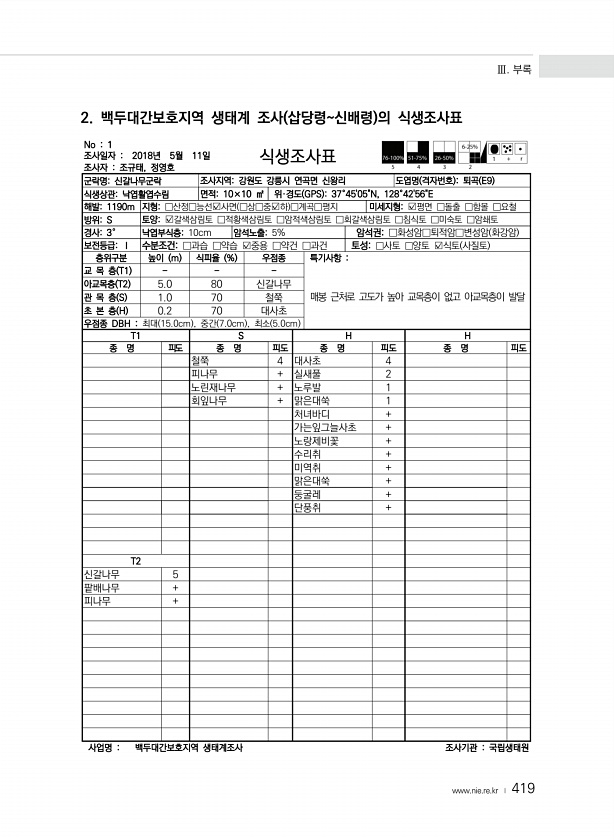 Ⅲ. 부록 www.nie.re.kr ? 419 2. 백두대간보호지역 생태계 조사 삽당령신배령 의 식생조사표 No 1 조사일자 2018년 5월 11일 조사자 조규태, 정영호 식생조사표 군락명신갈나무군락 조사지역강원도 강릉시 연곡면 신왕리 도엽명 격자번호 퇴곡 E9 식생상관낙엽활엽수림 면적10×10 ㎡ 위·경도 GPS 37°4505N, 128°4256E 해발1190m 지형□산정□능선?사면 □상□중?하 □계곡□평지 미세지형?평면 □돌출 □함몰 □요철 방위S 토양?갈색삼림토 □적황색삼림토 □암적색삼림토 □회갈색삼림토 □침식토 □미숙토 □암쇄토 경사3° 낙엽부식층10cm 암석노출5% 암석권□화성암□퇴적암□변성암 화강암 보전등급Ⅰ 수분조건□과습 □약습 ?중용 □약건 □과건 토성□사토 □양토 ?식토 사질토 층위구분 높이...