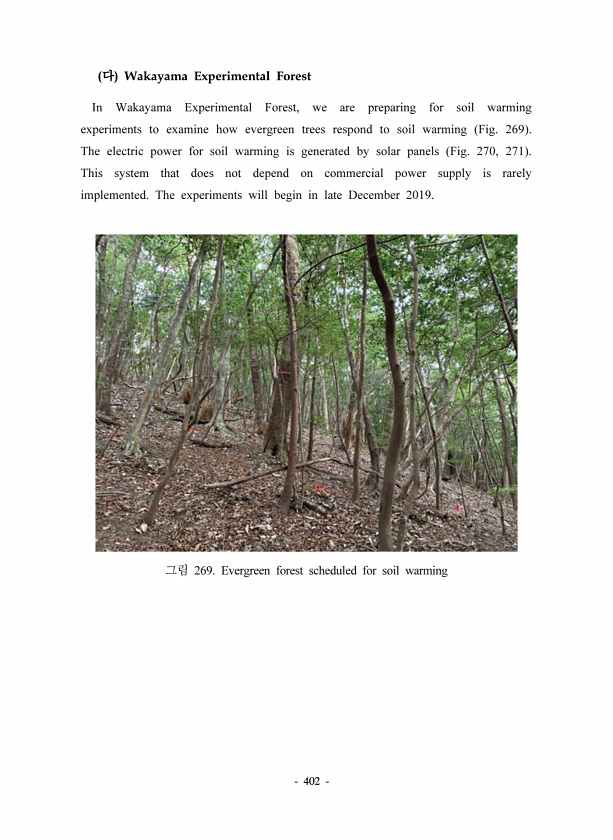 402 Wakayama Experimental Forest In Wakayama Experimental Forest, we are preparing for soil warming experiments to examine how evergreen trees respond to soil warming Fig. 269 The electric power for soil warming is generated by solar panels Fig. 270, 271 This system that does not depend on commercial power supply is rarely implemented. The experiments will begin in late December 2019. 269. Evergre...