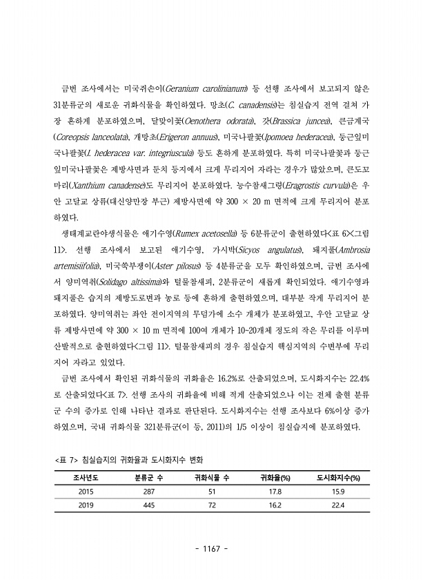 1167 금번 조사에서는 미국쥐손이 Geranium carolinianum 등 선행 조사에서 보고되지 않은 31분류군의 새로운 귀화식물을 확인하였다. 망초 C. canadensis 는 침실습지 전역 걸쳐 가 장 흔하게 분포하였으며, 달맞이꽃 Oenothera odorata , 갓 Brassica juncea , 큰금계국 Coreopsis lanceolata , 개망초 Erigeron annuus , 미국나팔꽃 Ipomoea hederacea , 둥근잎미 국나팔꽃 I. hederacea var. integriuscula 등도 흔하게 분포하였다. 특히 미국나팔꽃과 둥근 잎미국나팔꽃은 제방사면과 둔치 등지에서 크게 무리지어 자라는 경우가 많았으며, 큰도꼬 마리 Xanthium canadense 도 무리지어 분포하...