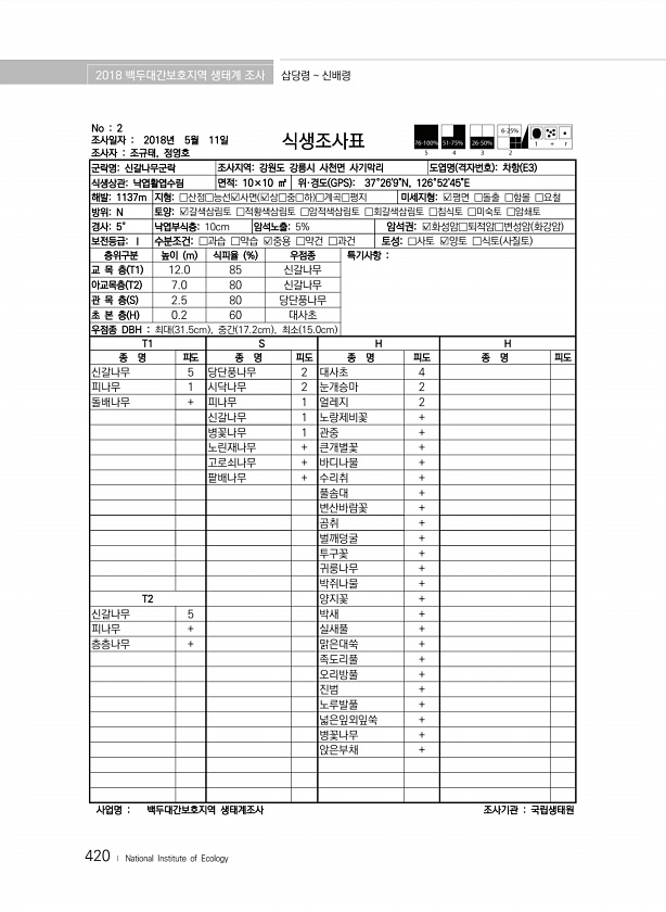 2018 백두대간보호지역 생태계 조사 삽당령 신배령 420 ? National Institute of Ecology No 2 조사일자 2018년 5월 11일 조사자 조규태, 정영호 식생조사표 군락명신갈나무군락 조사지역강원도 강릉시 사천면 사기막리 도엽명 격자번호 차항 E3 식생상관낙엽활엽수림 면적10×10 ㎡ 위·경도 GPS 37°269N, 126°5245E 해발1137m 지형□산정□능선?사면 ?상□중□하 □계곡□평지 미세지형?평면 □돌출 □함몰 □요철 방위N 토양?갈색삼림토 □적황색삼림토 □암적색삼림토 □회갈색삼림토 □침식토 □미숙토 □암쇄토 경사5° 낙엽부식층10cm 암석노출5% 암석권?화성암□퇴적암□변성암 화강암 보전등급Ⅰ 수분조건□과습 □약습 ?중용 □약건 □과건 토성□사토 ?양토 □식토 사질토 층위...