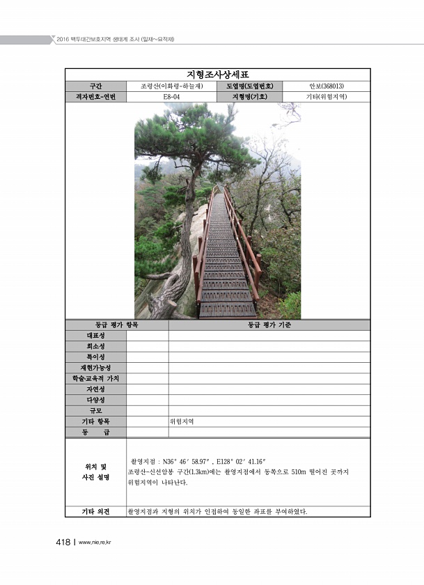 2016 백두대간보호지역 생태계 조사 밀재묘적재 418Ⅰwww.nie.re.kr 지형조사상세표 구간 조령산 이화령-하늘재 도엽명 도엽번호 안보 368013 격자번호-연번 E8-04 지형명 기호 기타 위험지역 등급 평가 항목 등급 평가 기준 대표성 희소성 특이성 재현가능성 학술?교육적 가치 자연성 다양성 규모 기타 항목 위험지역 등 급 위치 및 사진 설명 촬영지점 N36° 46′ 58.97″ , E128° 02′ 41.16″ 조령산신선암봉 구간 1.3km 에는 촬영지점에서 동쪽으로 510m 떨어진 곳까지 위험지역이 나타난다. 기타 의견 촬영지점과 지형의 위치가 인접하여 동일한 좌표를부여하였다.