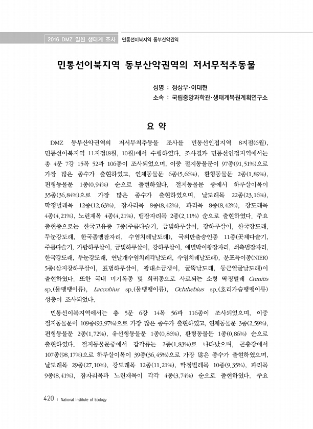 2016 DMZ 일원 생태계 조사 민통선이북지역 동부산악권역 420 ? National Institute of Ecology 민통선이북지역 동부산악권역의 저서무척추동물 성명 정상우·이대현 소속 국립중앙과학관·생태계복원계획연구소 요 약 DMZ 동부산악권역의 저서무척추동물 조사를 민통선인접지역 8지점 6월 , 민통선이북지역 11지점 8월, 10월 에서 수행하였다. 조사결과 민통선인접지역에서는 총 4문 7강 15목 52과 106종이 조사되었으며, 이중 절지동물문이 97종 91.51% 으로 가장 많은 종수가 출현하였고, 연체동물문 6종 5.66% , 환형동물문 2종 1.89% , 편형동물문 1종 0.94% 순으로 출현하였다. 절지동물문 중에서 하루살이목이 35종 36.84% 으로 가장 많은 종수가 출현하였으며, 날...