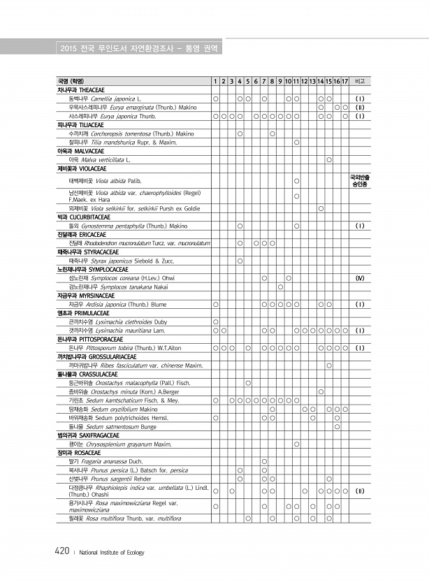 2015 전국 무인도서 자연환경조사 통영 권역 420 ? National Institute of Ecology 국명 학명 1 2 3 4 5 6 7 8 9 10 11 12 13 14 15 16 17 비고 차나무과 THEACEAE 동백나무 Camellia japonica L. ○ ○ ○ ○ ○ ○ ○ ○ Ⅰ 우묵사스레피나무 Eurya emarginata Thunb. Makino ○ ○ ○ Ⅱ 사스레피나무 Eurya japonica Thunb. ○ ○ ○ ○ ○ ○ ○ ○ ○ ○ ○ ○ ○ Ⅰ 피나무과 TILIACEAE 수까치깨 Corchoropsis tomentosa Thunb. Makino ○ ○ 찰피나무 Tilia mandshurica Rupr. & Maxim. ○ 아욱과 MALVACEAE 아욱 Malva ...