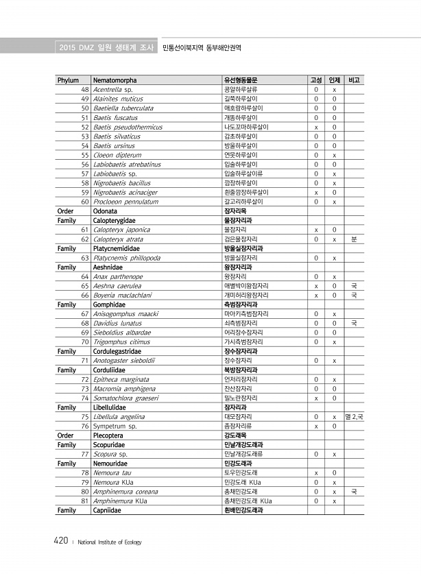 2015 DMZ 일원 생태계 조사 민통선이북지역 동부해안권역 420 ? National Institute of Ecology Phylum Nematomorpha 유선형동물문 고성 인제 비고 48 Acentrella sp. 콩알하루살류 0 x 49 Alainites muticus 길쭉하루살이 0 0 50 Baetiella tuberculata 애호랑하루살이 0 0 51 Baetis fuscatus 개똥하루살이 0 0 52 Baetis pseudothermicus 나도꼬마하루살이 x 0 53 Baetis silvaticus 감초하루살이 0 0 54 Baetis ursinus 방울하루살이 0 0 55 Cloeon dipterum 연못하루살이 0 x 56 Labiobaetis atrebatinus 입술하루살이 0 ...