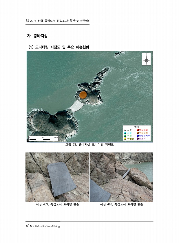 2016 전국 특정도서 정밀조사 옹진-남부권역 416 ? National Institute of Ecology 자. 중바지섬 1 모니터링 지점도 및 주요 훼손현황 그림 79. 중바지섬 모니터링 지점도 사진 409. 특정도서 표지판 훼손 사진 410. 특정도서 표지판훼손