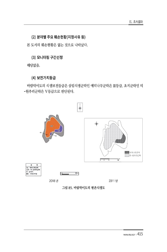 II. 조사결과 www.nie.re.kr ?415 2 본 도서의 훼손현황은 없는 것으로 나타났다. 3 해당없음. 4 바람막이도의 식생보전등급은 삼림식생군락인 예덕나무군락은 Ⅲ등급, 초지군락인 띠 -원추리군락은 Ⅴ등급으로 판단된다. 2018 년 2011 년 그림 85. 바람막이도의현존식생도