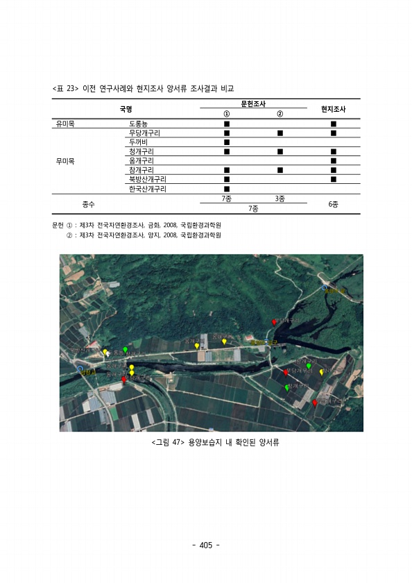 405 국명 문헌조사 현지조사 ① ② 유미목 도롱뇽 ■ ■ 무미목 무당개구리 ■ ■ ■ 두꺼비 ■ 청개구리 ■ ■ ■ 옴개구리 ■ 참개구리 ■ ■ ■ 북방산개구리 ■ ■ 한국산개구리 ■ 종수 7종 3종 종6 종7 표 23 이전 연구사례와 현지조사 양서류 조사결과 비교 문헌 제 차 전국자연환경조사 금화 국립환경과학원 ① 3 , , 2008, ② 3 , , 2008, 제 차 전국자연환경조사 양지 국립환경과학원 그림 47 용양보습지 내 확인된양서류