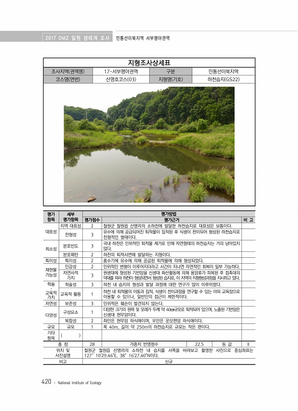 2017 DMZ 일원 생태계 조사 민통선이북지역 서부평야권역 420 ? National Institute of Ecology 지형조사상세표 조사지역 권역명 17-서부평야권역 구분 민통선이북지역 코스명 연번 산명호코스 03 지형명 기호 하천습지 GS22 평가 항목 세부 평가항목 평가방법 평가점수 평가근거 비 고 대표성 지역 대표성 2 철원군 철원읍 산명리의 소하천에 발달한 하천습지로 대표성은 보통이다. 전형성 3 유수에 의해 공급되어진 퇴적물이 집적된 후 식생이 천이되어 형성된 하천습지로 전형적인 형태이다. 희소성 분포빈도 3 국내 하천은 인위적인 퇴적물 제거로 인해 자연형태의 하천습지는 거의 남아있지 않다. 분포패턴 2 하천의 퇴적사면에 발달하는 지형이다. 특이성 특이성 2 홍수기에 유수에 의해 공급된 퇴적...