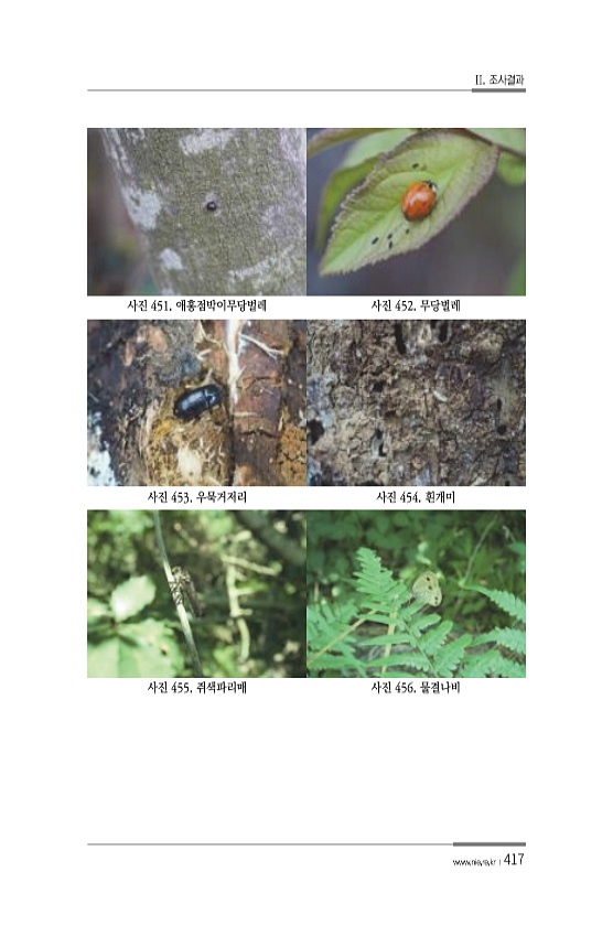 II. 조사결과 www.nie.re.kr ?417 사진 451. 애홍점박이무당벌레 사진 452. 무당벌레 사진 453. 우묵거저리 사진 454. 흰개미 사진 455. 쥐색파리매 사진 456.물결나비