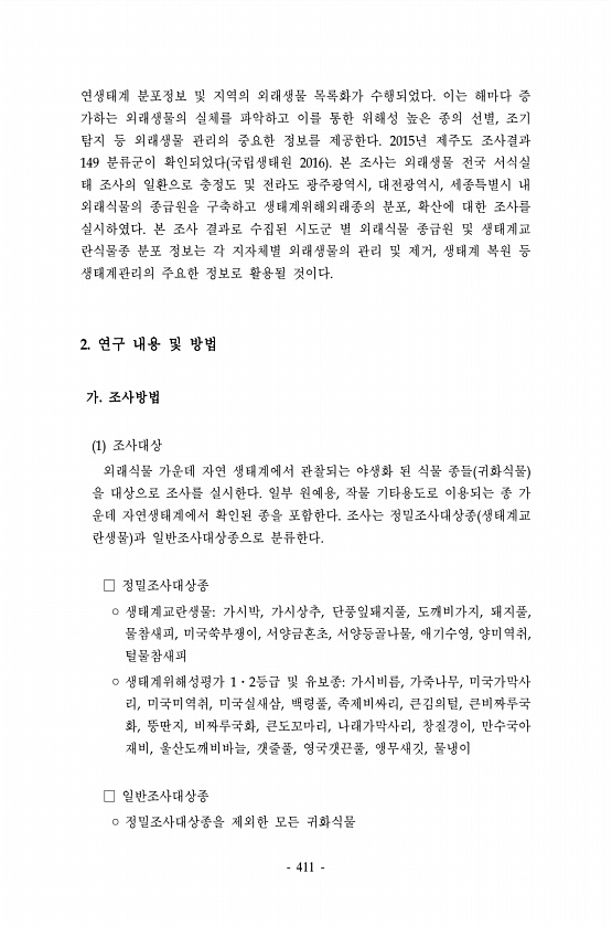 411 연생태계 분포정보 및 지역의 외래생물 목록화가 수행되었다. 이는 해마다 증 가하는 외래생물의 실체를 파악하고 이를 통한 위해성 높은 종의 선별, 조기 탐지 등 외래생물 관리의 중요한 정보를 제공한다. 2015년 제주도 조사결과 149 분류군이 확인되었다 국립생태원 2016 본 조사는 외래생물 전국 서식실 태 조사의 일환으로 충정도 및 전라도 광주광역시, 대전광역시, 세종특별시 내 외래식물의 종급원을 구축하고 생태계위해외래종의 분포, 확산에 대한 조사를 실시하였다. 본 조사 결과로 수집된 시도군 별 외래식물 종급원 및 생태계교 란식물종 분포 정보는 각 지자체별 외래생물의 관리 및 제거, 생태계 복원 등 생태계관리의 주요한 정보로 활용될 것이다. 2. 연구 내용 및 방법 가. 조사방법 1 조사대상 외래식...