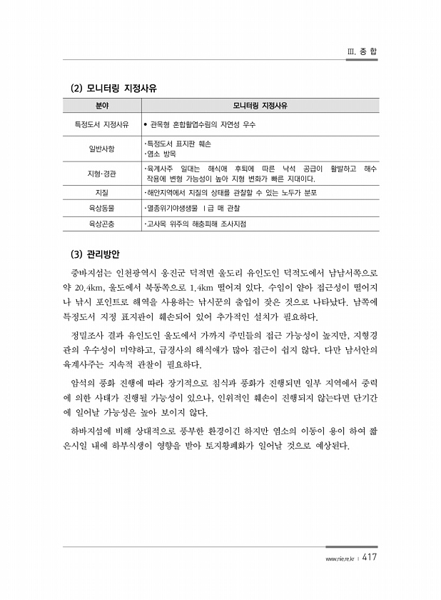 Ⅲ. 종 합 www.nie.re.kr ? 417 2 모니터링 지정사유 분야 모니터링 지정사유 특정도서 지정사유 ? 관목형 혼합활엽수림의 자연성 우수 일반사항 ?특정도서 표지판 훼손 ?염소 방목 지형·경관 ?육계사주 일대는 해식애 후퇴에 따른 낙석 공급이 활발하고 해수 작용에 변형 가능성이 높아 지형 변화가 빠른 지대이다. 지질 ?해안지역에서 지질의 상태를 관찰할 수 있는 노두가 분포 육상동물 ?멸종위기야생생물 Ⅰ급 매 관찰 육상곤충 ?고사목 위주의 해충피해 조사지점 3 관리방안 중바지섬는 인천광역시 옹진군 덕적면 울도리 유인도인 덕적도에서 남남서쪽으로 약 20.4km, 울도에서 북동쪽으로 1.4km 떨어져 있다. 수임이 얕아 접근성이 떨어지 나 낚시 포인트로 해역을 사용하는 낚시꾼의 출입이 잦은 것으로 나타...