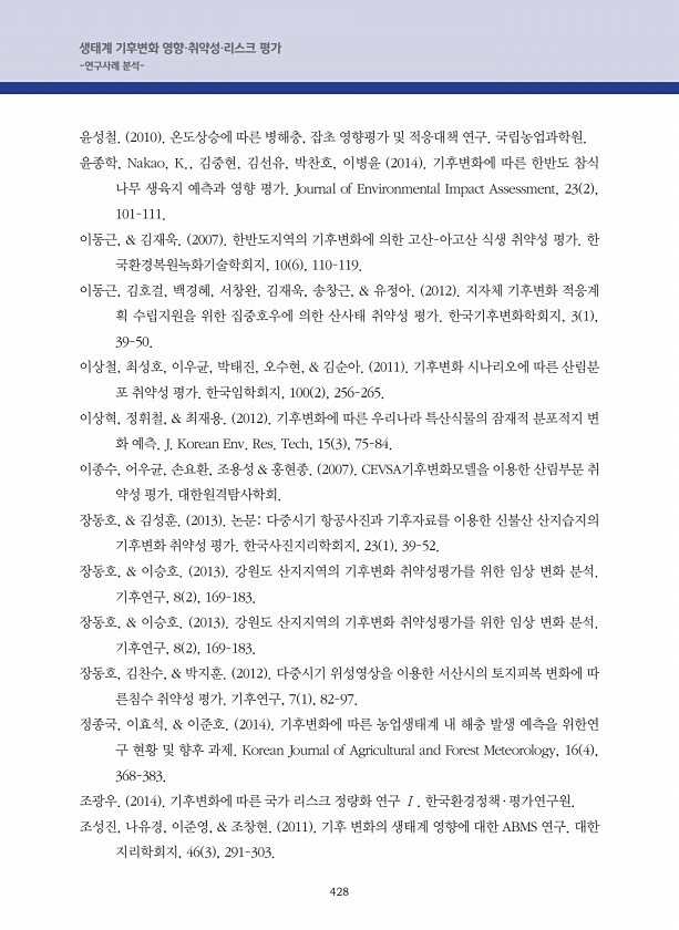 428 생태계 기후변화 영향·취약성·리스크 평가 -연구사례 분석- 윤성철. 2010 온도상승에 따른 병해충, 잡초 영향평가 및 적응대책 연구. 국립농업과학원. 윤종학, Nakao, K., 김중현, 김선유, 박찬호, 이병윤 2014 기후변화에 따른 한반도 참식 나무 생육지 예측과 영향 평가. Journal of Environmental Impact Assessment, 23 2 , 101-111. 이동근, & 김재욱. 2007 한반도지역의 기후변화에 의한 고산-아고산 식생 취약성 평가. 한 국환경복원녹화기술학회지, 10 6 , 110-119. 이동근, 김호걸, 백경혜, 서창완, 김재욱, 송창근, & 유정아. 2012 지자체 기후변화 적응계 획 수립지원을 위한 집중호우에 의한 산사태 취약성 평가. 한국기후변화학...