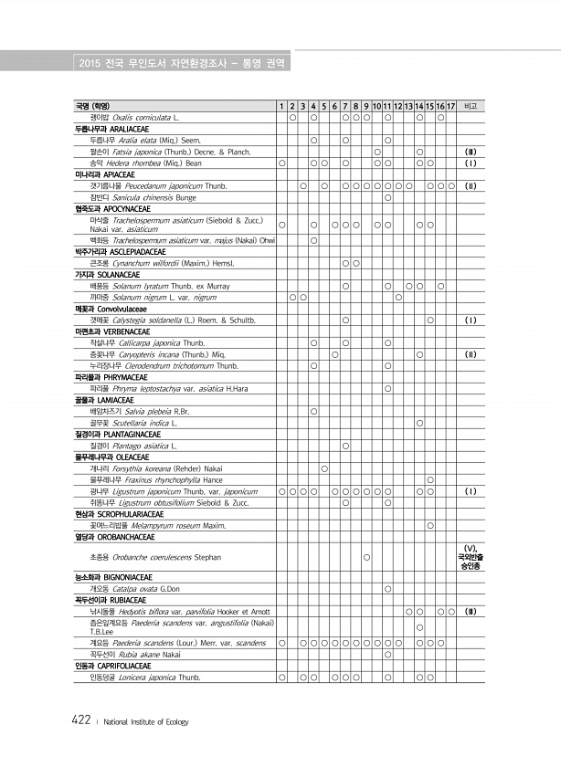 2015 전국 무인도서 자연환경조사 통영 권역 422 ? National Institute of Ecology 국명 학명 1 2 3 4 5 6 7 8 9 10 11 12 13 14 15 16 17 비고 괭이밥 Oxalis corniculata L. ○ ○ ○ ○ ○ ○ ○ ○ 두릅나무과 ARALIACEAE 두릅나무 Aralia elata Miq. Seem. ○ ○ ○ 팔손이 Fatsia japonica Thunb. Decne. & Planch. ○ ○ Ⅲ 송악 Hedera rhombea Miq. Bean ○ ○ ○ ○ ○ ○ ○ ○ Ⅰ 미나리과 APIACEAE 갯기름나물 Peucedanum japonicum Thunb. ○ ○ ○ ○ ○ ○ ○ ○ ○ ○ ○ ○ Ⅱ 참반디 Sanicula chinensis ...