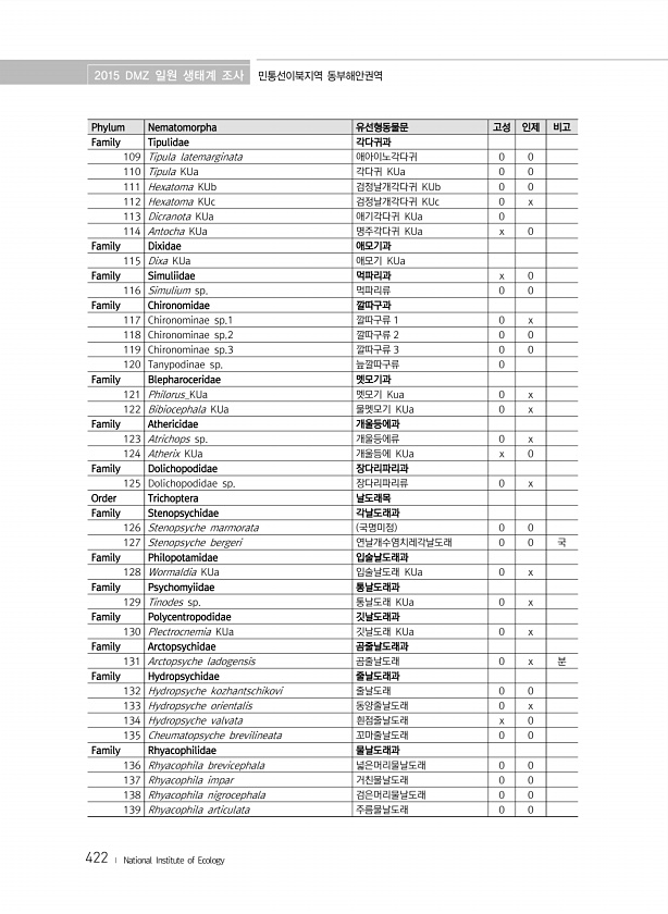 2015 DMZ 일원 생태계 조사 민통선이북지역 동부해안권역 422 ? National Institute of Ecology Phylum Nematomorpha 유선형동물문 고성 인제 비고 Family Tipulidae 각다귀과 109 Tipula latemarginata 애아이노각다귀 0 0 110 Tipula KUa 각다귀 KUa 0 0 111 Hexatoma KUb 검정날개각다귀 KUb 0 0 112 Hexatoma KUc 검정날개각다귀 KUc 0 x 113 Dicranota KUa 애기각다귀 KUa 0 114 Antocha KUa 명주각다귀 KUa x 0 Family Dixidae 애모기과 115 Dixa KUa 애모기 KUa Family Simuliidae 먹파리과 x 0 116 Simulium s...