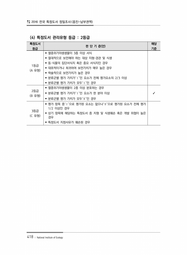 2016 전국 특정도서 정밀조사 옹진-남부권역 418 ? National Institute of Ecology 4 특정도서 관리유형 등급 2등급 특정도서 등급 판 단 기 준 안 해당 기준 1등급 A 유형 ? 멸종위기야생생물이 3종 이상 서식 ? 절대적으로 보전해야 하는 대상 지형·경관 및 식생 ? 동·식물의 집단서식지 혹은 중요 서식지인 경우 ? 대표적이거나 희귀하여 보전가치가 매우 높은 경우 ? 학술적으로 보전가치가 높은 경우 ? 분류군별 평가 가치가‘Ⅰ’인 요소가 전체 평가요소의 2/3 이상 ? 분류군별 평가 가치가 모두‘Ⅰ’인 경우 2등급 B 유형 ? 멸종위기야생생물이 2종 이상 분포하는 경우 ? 분류군별 평가 가치가‘Ⅰ’인 요소가 한 분야 이상 ? ? 분류군별 평가 가치가 모두‘Ⅱ’인 경우 3등급 C...