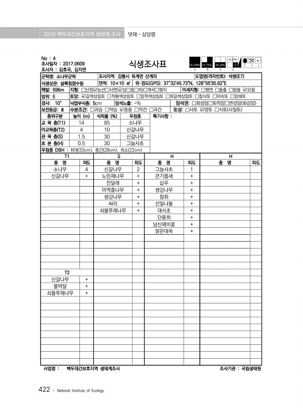 2018 백두대간보호지역 생태계 조사 댓재 삽당령 422 ? National Institute of Ecology No 4 조사일자 2017.0609 조사자 김호국, 김지연 식생조사표 군락명소나무군락 조사지역강릉시 옥계면 산계리 도엽명 격자번호 석병 E7 식생상관살록침엽수림 면적10×10 ㎡ 위·경도 GPS 37°3245.73N, 128°5535.62E 해발596m 지형□산정?능선□사면 ?상□중□하 □계곡□평지 미세지형□평면 □돌출 □함몰 ?요철 방위E 토양?갈색삼림토 □적황색삼림토 □암적색삼림토 □회갈색삼림토 □침식토 □미숙토 □암쇄토 경사10° 낙엽부식층5cm 암석노출-% 암석권□화성암□퇴적암□변성암 화강암 보전등급Ⅲ 수분조건□과습 □약습 ?중용 □약건 □과건 토성□사토 ?양토 □식토 사질토 층위구분 높...