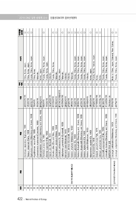 422 ? National Institute of Ecology 번호 과명 학명 국명 적색 목록 서식지 국외반출 승인종 29 Stemmops nipponicus Yaginuma, 1969 검정토시꼬마거미 LC. China, Korea, Japan. ○ 30 Takayus takayensis Saito, 1939 넉점꼬마거미 LC. China, Korea, Japan. ○ 31 Yaginumena castrata B?senberg and Strand, 1906 검정미진거미 LC. Russia, China, Korea, Japan. ○ 32 접시거미과 LINYPHIIDAE Anguliphantes nasus Paik, 1965 코접시거미 LC. China, Korea. 33 Cresmatoneta mutinen...