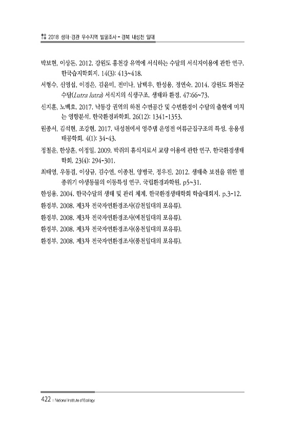 2018 생태·경관 우수지역 발굴조사 경북 내성천 일대 422 ? National Institute of Ecology 박보현, 이상돈. 2012. 강원도 홍천강 유역에 서식하는 수달의 서식지이용에 관한 연구. 한국습지학회지. 14 3 413418. 서형수, 신영섭, 이경은, 김윤미, 전미나, 남택우, 한성용, 정연숙. 2014. 강원도 화천군 수달 Lutra lutra 서식지의 식생구조. 생태와 환경. 476673. 신지훈, 노백호. 2017. 낙동강 권역의 하천 수면공간 및 수변환경이 수달의 출현에 미치 는 영향분석. 한국환경과학회. 26 12 1341-1353. 원종서, 김석현, 조강현. 2017. 내성천에서 영주댐 운영전 어류군집구조의 특성. 응용생 태공학회. 4 1 34-43. 정철운, 한상훈, 이...