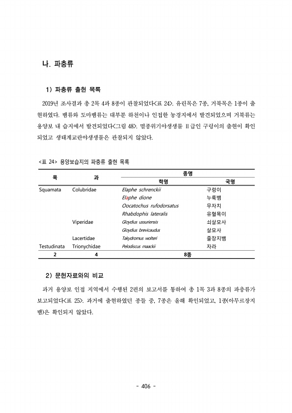 406 2019년 조사결과 총 목 과 종이 관찰되었다 표 유린목은 종 거북목은 종이 출 2 4 8 24 7 , 1 현하였다 뱀류와 도마뱀류는 대부분 하천이나 인접한 농경지에서 발견되었으며 거북류는 용양보 내 습지에서 발견되었다 그림 멸종위기야생생물 급인 구렁이의 출현이 확인 48 Ⅱ 되었고 생태계교란야생생물은 관찰되지 않았다. 목 과 종명 학명 국명 Squamata Colubridae Elaphe schrenckii 구렁이 Elaphe dione 누룩뱀 Oocatochus rufodorsatus 무자치 Rhabdophis lateralis 유혈목이 Viperidae Gloydius ussuriensis 쇠살모사 Gloydius brevicaudus 살모사 Lacertidae Takydromus wolteri...