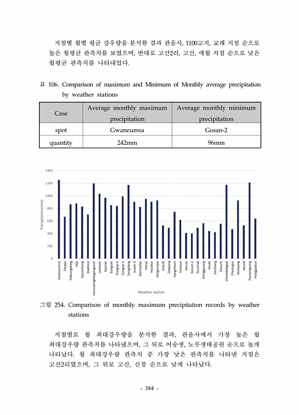 384 지점별 월별 평균 강우량을 분석한 결과 관음사, 1100고지, 교래 지점 순으로 높은 월평균 관측치를 보였으며, 반대로 고산2리, 고산, 애월 지점 순으로 낮은 월평균 관측치를 나타내었다. Case Average monthly maximum precipitation Average monthly minimum precipitation spot Gwaneumsa Gosan-2 quantity 242mm 96mm 표 106. Comparison of maximum and Minimum of Monthly average precipitation by weather stations 그림 254. Comparison of monthly maximum precipitation records by weather s...