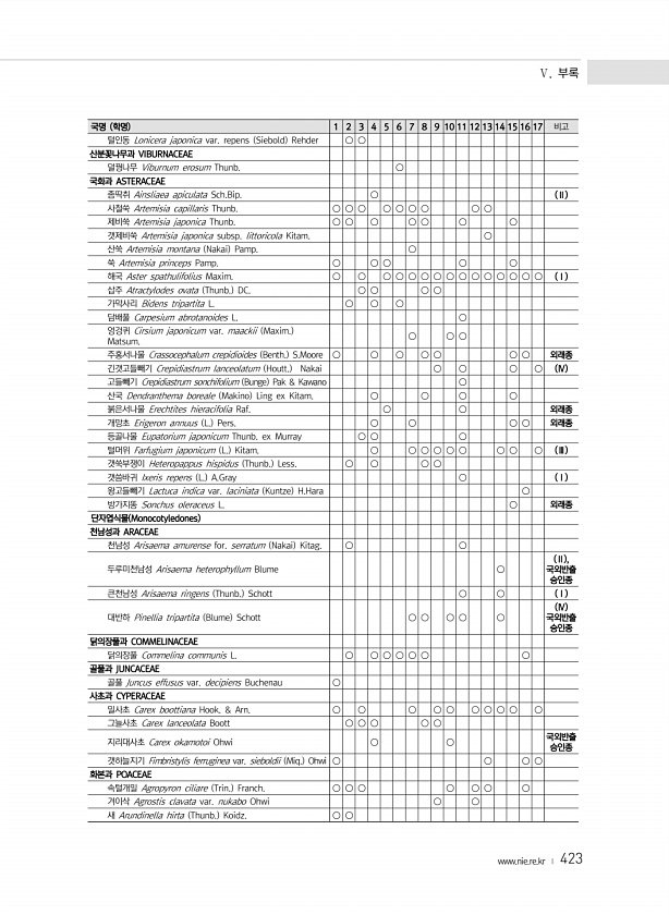 Ⅴ. 부록 www.nie.re.kr ? 423 국명 학명 1 2 3 4 5 6 7 8 9 10 11 12 13 14 15 16 17 비고 털인동 Lonicera japonica var. repens Siebold Rehder ○ ○ 산분꽃나무과 VIBURNACEAE 덜꿩나무 Viburnum erosum Thunb. ○ 국화과 ASTERACEAE 좀딱취 Ainsliaea apiculata Sch.Bip. ○ Ⅱ 사철쑥 Artemisia capillaris Thunb. ○ ○ ○ ○ ○ ○ ○ ○ ○ 제비쑥 Artemisia japonica Thunb. ○ ○ ○ ○ ○ ○ ○ 갯제비쑥 Artemisia japonica subsp. littoricola Kitam. ○ 산쑥 Artemisia montana Na...