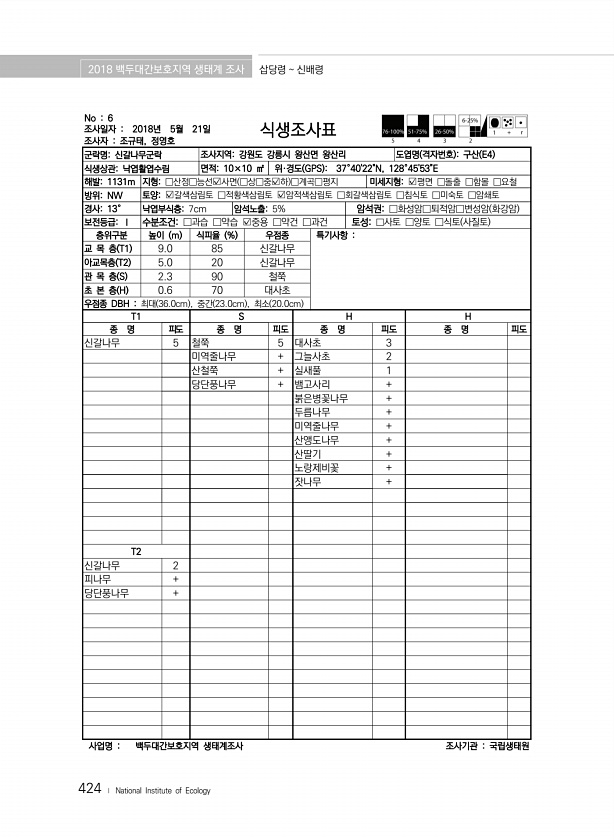 2018 백두대간보호지역 생태계 조사 삽당령 신배령 424 ? National Institute of Ecology No 6 조사일자 2018년 5월 21일 조사자 조규태, 정영호 식생조사표 군락명신갈나무군락 조사지역강원도 강릉시 왕산면 왕산리 도엽명 격자번호 구산 E4 식생상관낙엽활엽수림 면적10×10 ㎡ 위·경도 GPS 37°4022N, 128°4553E 해발1131m 지형□산정□능선?사면 □상□중?하 □계곡□평지 미세지형?평면 □돌출 □함몰 □요철 방위NW 토양?갈색삼림토 □적황색삼림토 ?암적색삼림토 □회갈색삼림토 □침식토 □미숙토 □암쇄토 경사13° 낙엽부식층7cm 암석노출5% 암석권□화성암□퇴적암□변성암 화강암 보전등급Ⅰ 수분조건□과습 □약습 ?중용 □약건 □과건 토성□사토 □양토 □식토 사질토 층...