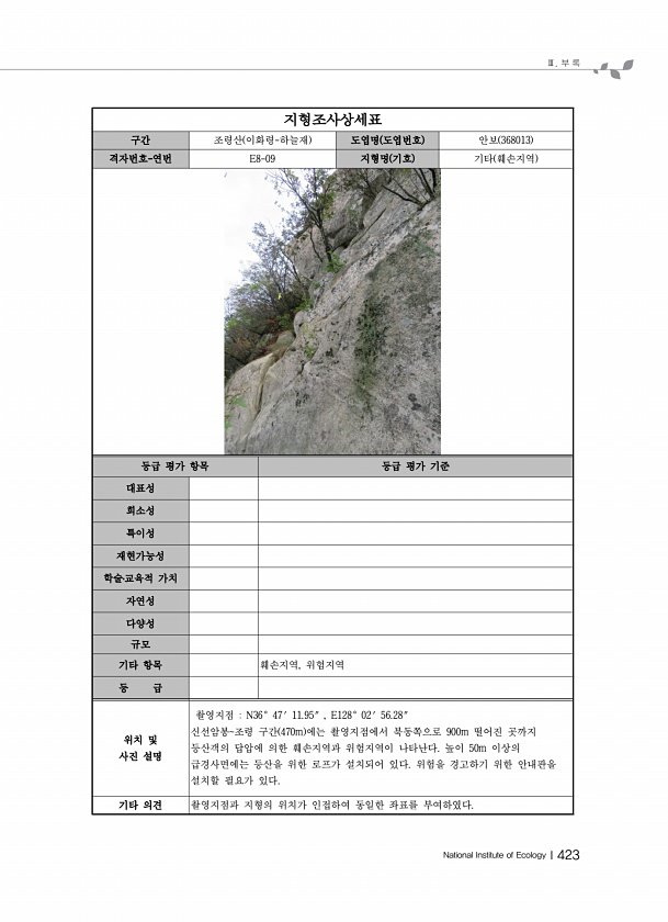 Ⅲ. 부 록 National Institute of EcologyⅠ423 지형조사상세표 구간 조령산 이화령-하늘재 도엽명 도엽번호 안보 368013 격자번호-연번 E8-09 지형명 기호 기타 훼손지역 등급 평가 항목 등급 평가 기준 대표성 희소성 특이성 재현가능성 학술?교육적 가치 자연성 다양성 규모 기타 항목 훼손지역, 위험지역 등 급 위치 및 사진 설명 촬영지점 N36° 47′ 11.95″ , E128° 02′ 56.28″ 신선암봉조령 구간 470m 에는 촬영지점에서 북동쪽으로 900m 떨어진 곳까지 등산객의 답압에 의한 훼손지역과 위험지역이 나타난다. 높이 50m 이상의 급경사면에는 등산을 위한 로프가 설치되어 있다. 위험을 경고하기 위한 안내판을 설치할 필요가 있다. 기타 의견 촬영지점과 지형의 위치...